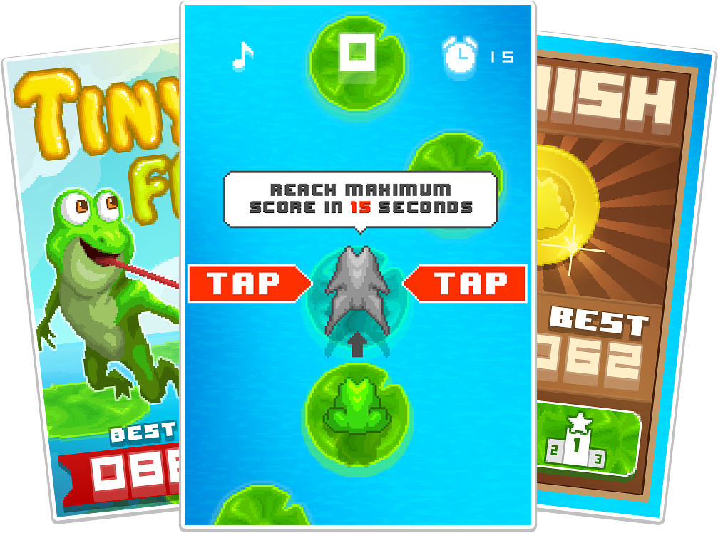 Discover now for free our new addicting game Tiny Frog on IOS and ANDROID !A tiny green frog hop off floating leaves to stay alive.The gameplay is very easy: tap the screen with your fingers to make the little frog jump and use all your reflexes and promptness to jump as many leaves as possible. Each gameplay will last 15 seconds so your aim is to make a new record every time. Reach your maximum score in 15 seconds.Remember that the little frog cannot maintain his life in water and as soon as he will touch water your game will be over and you have to start again.You can decide the speed of the frog, just be careful not to let him jump in the water.Be careful, any mistake will result in instant death and a respawn at the beginning of the level.Very nice music, sound effects and animation when the frog jumps and when he touches water.Once again redBit games chose pixel art with fresh and bright colours, a friendly character and a simple background.